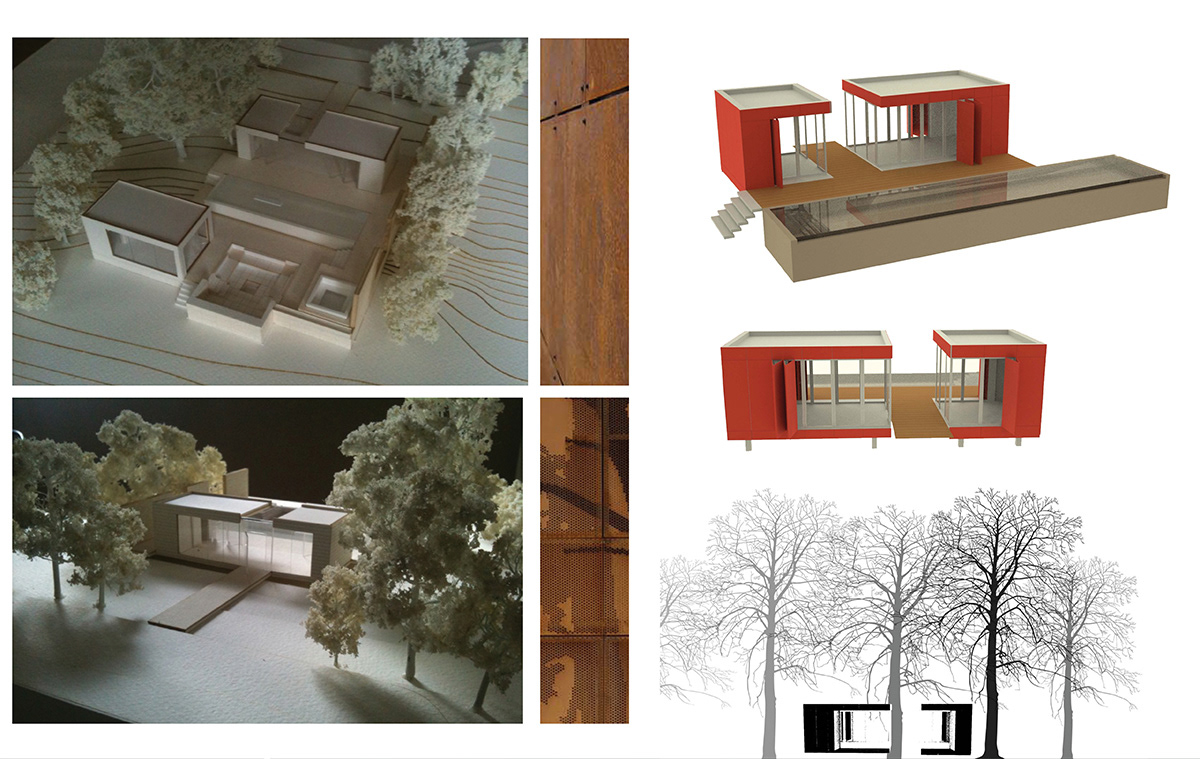 Design consists of two structures joined by a glazed walk way with concertina perforated Corten Steel screens.