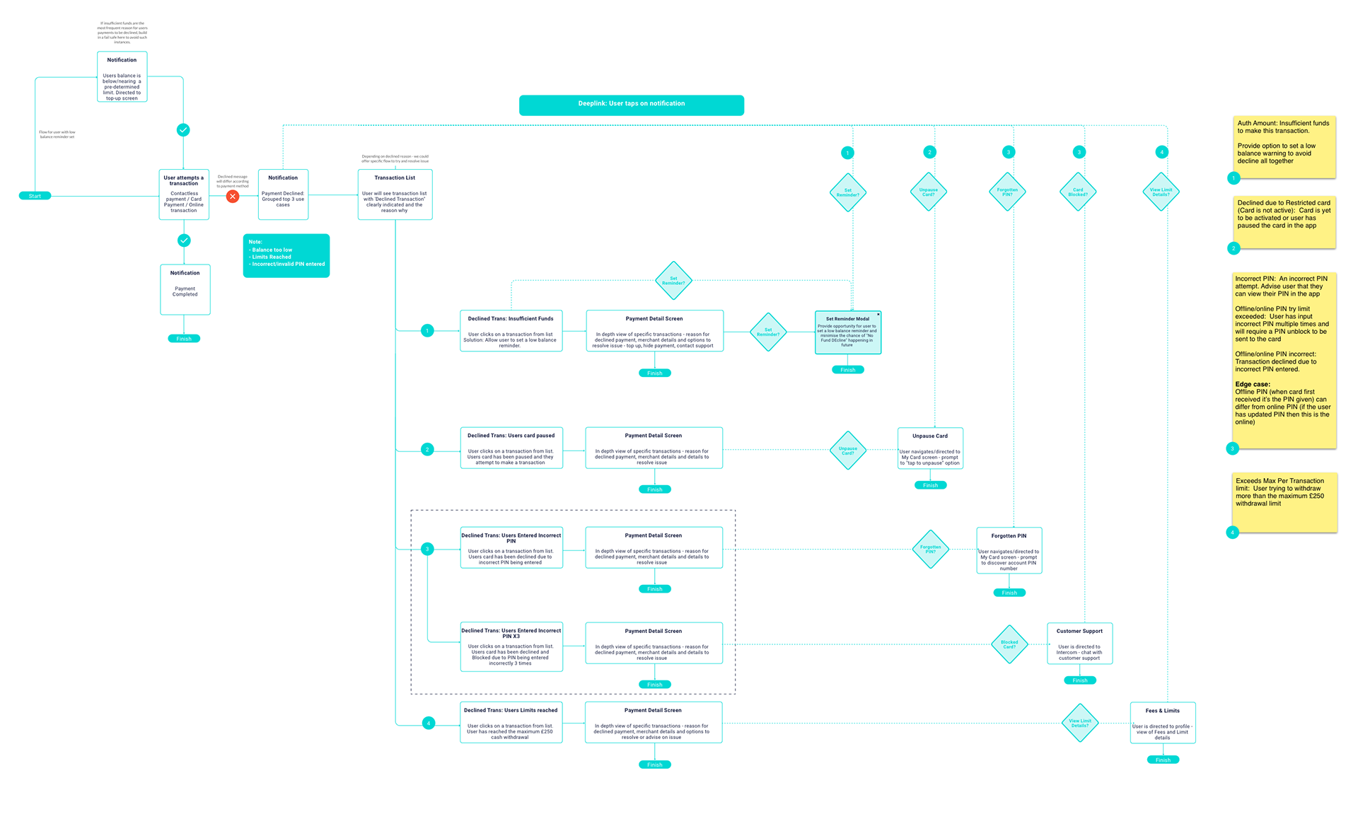 Our users were often in a position where they’d have transactions declined. This could be for any number of reasons but we didn’t have the functionality to inform the user, letting them know why the transaction was declined and secondly, a means on how best to correct this. The result was Customer Ops getting inundated with decline related queries so the key metric with this feature was reducing the amount of queries reaching Customer Ops.