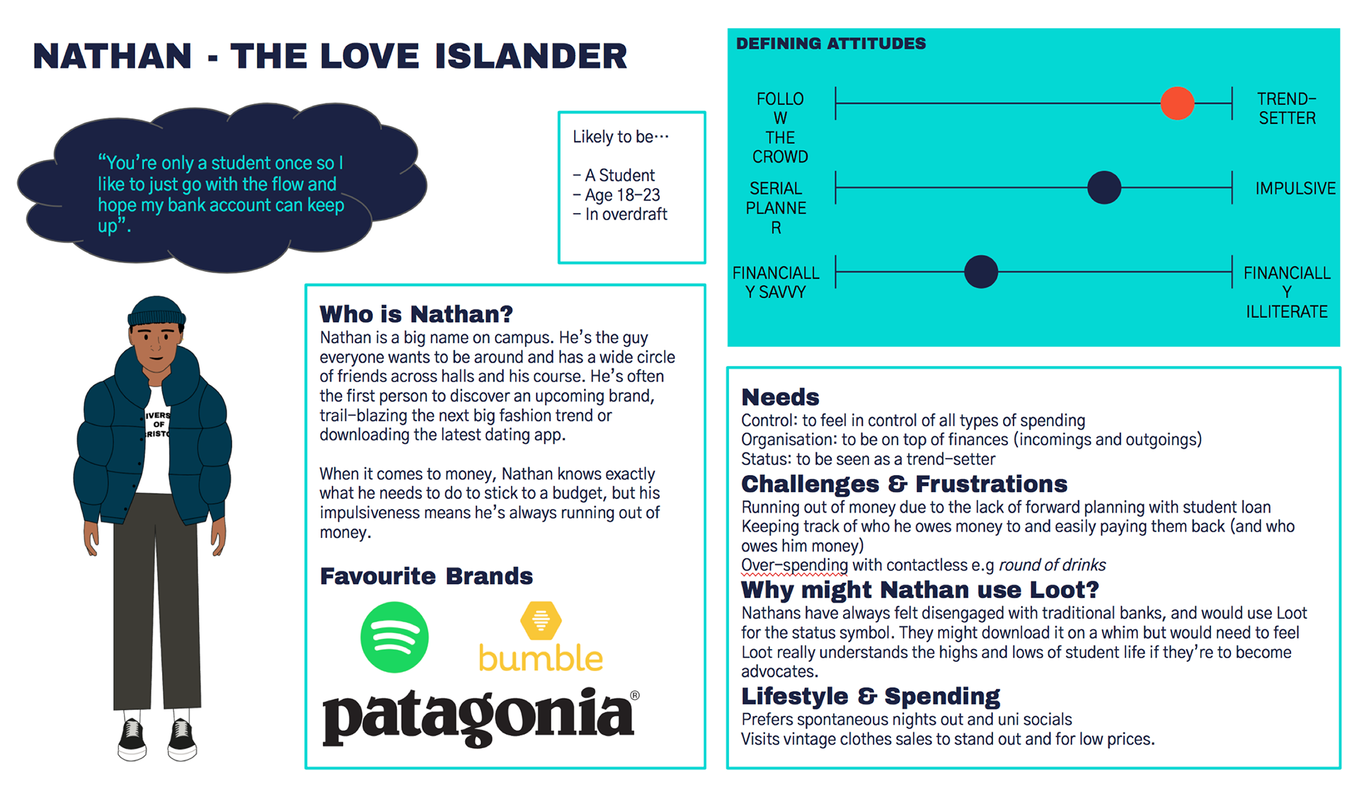 Nathan lacks forward planning and keeping track finances. He’s often over-spending due to getting carried away with contactless payments. Nathan is young, studying, on tighter budget and more of a socialite and therefore tends to be more likely to have a transactions declined.